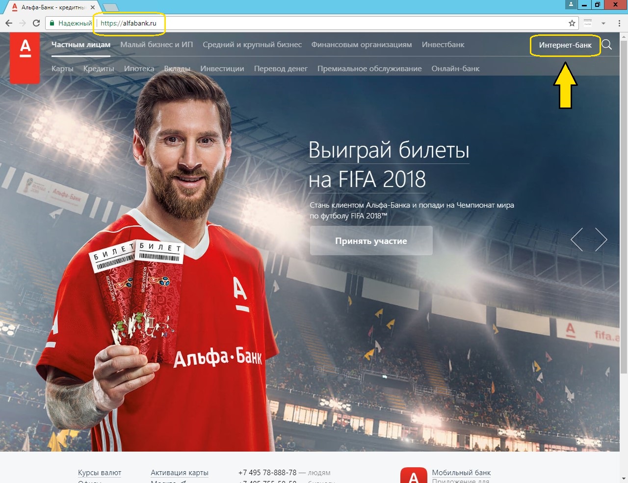 - Войдите на сайт Альфа-банка https://alfabank.ru/ и нажмите кнопку «Интернет-банк».