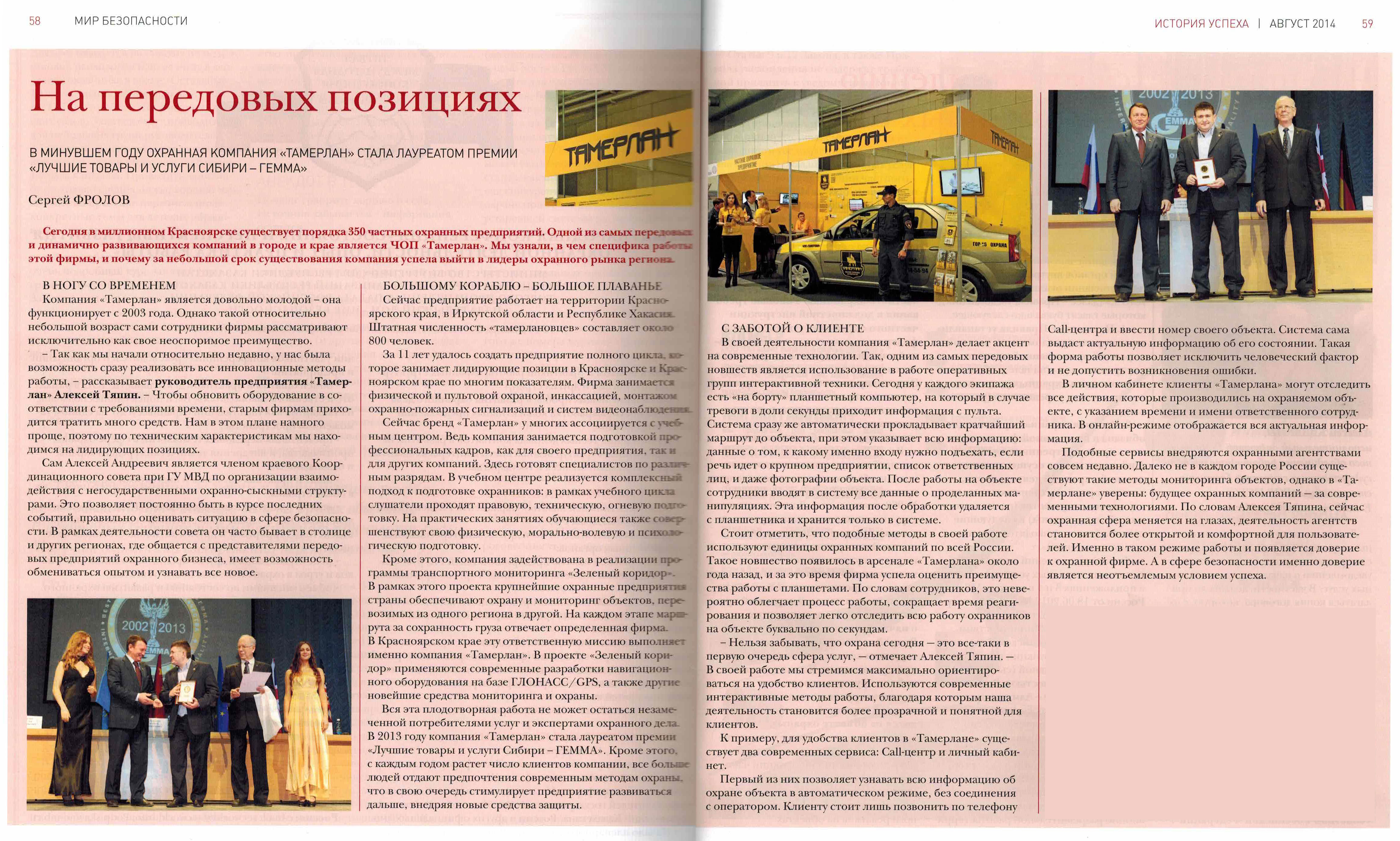 В МИНУВШЕМ ГОДУ ОХРАННАЯ ФИРМА «ТАМЕРЛАН» СТАЛА ЛАУРЕАТОМ ПРЕМИИ «ЛУЧШИЕ ТОВАРЫ И УСЛУГИ СИБИРИ - ГЕММА»